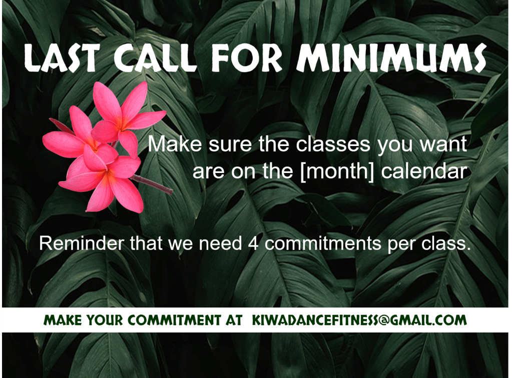A “last call” to meet the minimum requirement will be posted around the 26th of each month on Facebook. If I don’t have sufficient interest by the 28th, a class may not be scheduled. Image may vary. Reserve your spot kiwadancefitness@gmail.com.