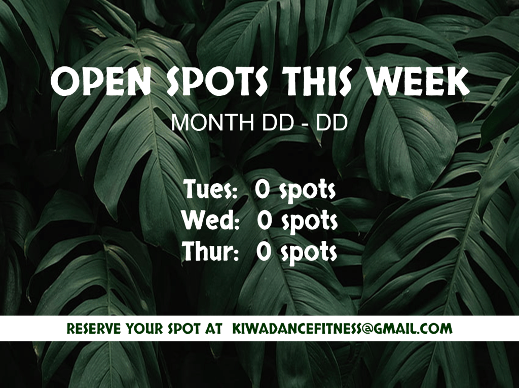 On Sunday or Monday, I will post on Facebook the number of spots on the dance floor that are still open for each class in the upcoming week. Image will vary. Reserve your spot kiwadancefitness@gmail.com.